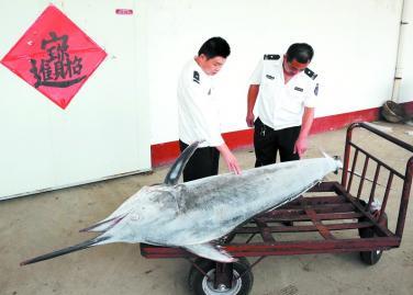 當(dāng)日,經(jīng)市漁政部門工作人員測量,該魚體長2.84米,初步鑒定為旗魚,非國家保護的水生野生動物。